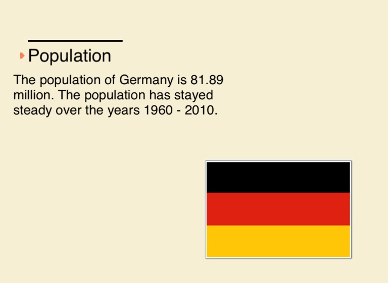 The population of Germany is 81.89 million. The population has stayed steady over the years 1960 - 2010.