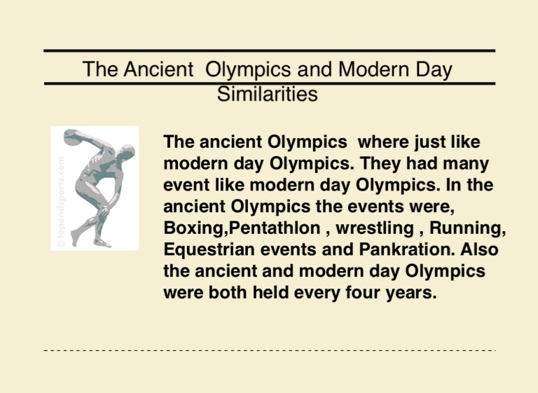The ancient Olympics where just like modern day Olympics. They had many event like modern day Olympics. In the ancient Olympics the events were, Boxing,Pentathlon , wrestling , Running, Equestrian events and Pankration. Also the ancient and modern day Olympics were both held every four years.