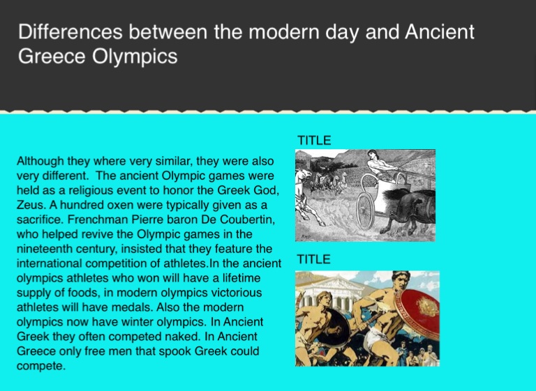 Although they where very similar, they were also very different. The ancient Olympic games were held as a religious event to honor the Greek God, Zeus. A hundred oxen were typically given as a sacrifice. Frenchman Pierre baron De Coubertin, who helped revive the Olympic games in the nineteenth century, insisted that they feature the international competition of athletes.In the ancient olympics athletes who won will have a lifetime supply of foods, in modern olympics victorious athletes will have medals. Also the modern olympics now have winter olympics. In Ancient Greek they often competed naked. In Ancient Greece only free men that spook Greek could compete.