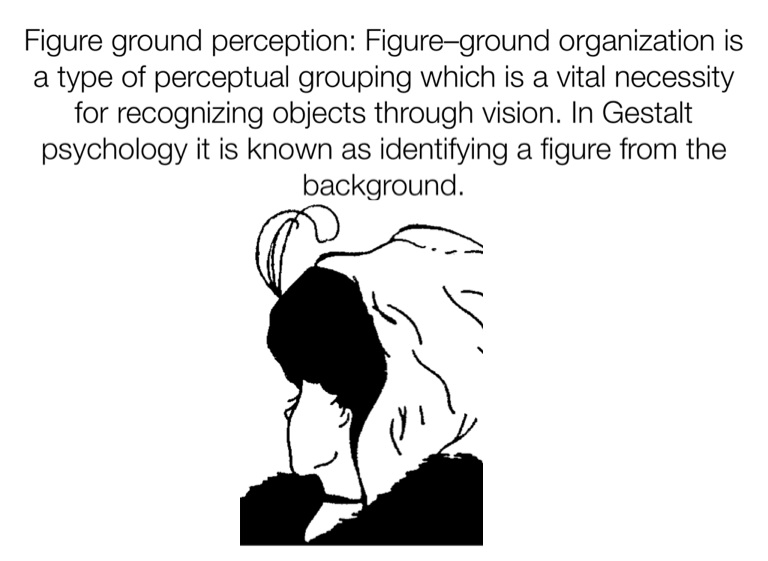 Figure ground perception: Figure–ground organization is a type of perceptual grouping which is a vital necessity for recognizing objects through vision. In Gestalt psychology it is known as identifying a figure from the background.