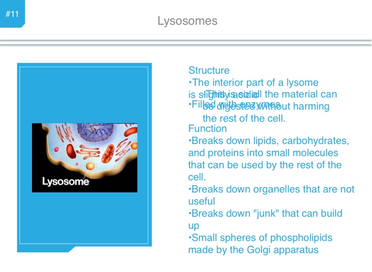 •Breaks down lipids, carbohydrates, and proteins into small molecules that can be used by the rest of the cell.