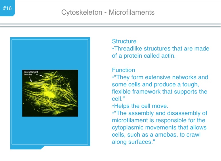 •"The assembly and disassembly of microfilament is responsible for the cytoplasmic movements that allows cells, such as a amebas, to crawl along surfaces."