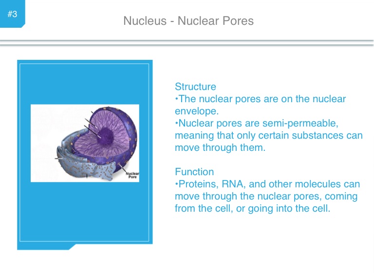 •Nuclear pores are semi-permeable, meaning that only certain substances can move through them.