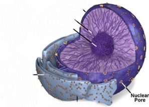 •Proteins, RNA, and other molecules can move through the nuclear pores, coming from the cell, or going into the cell.