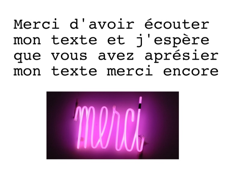Merci d'avoir écouter mon texte et j'espère que vous avez aprésier mon texte merci encore