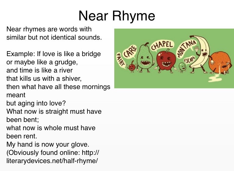 Near rhymes are words with similar but not identical sounds.