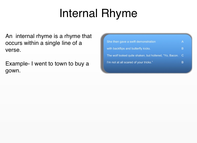 An internal rhyme is a rhyme that occurs within a single line of a verse.