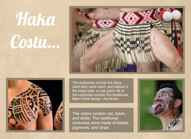 The costumes include the tatua (skirt-like) waist band, and tattoos it the tribal style, or war paint. All of the costumes contain the traditional Māori tribal design, the taniko.