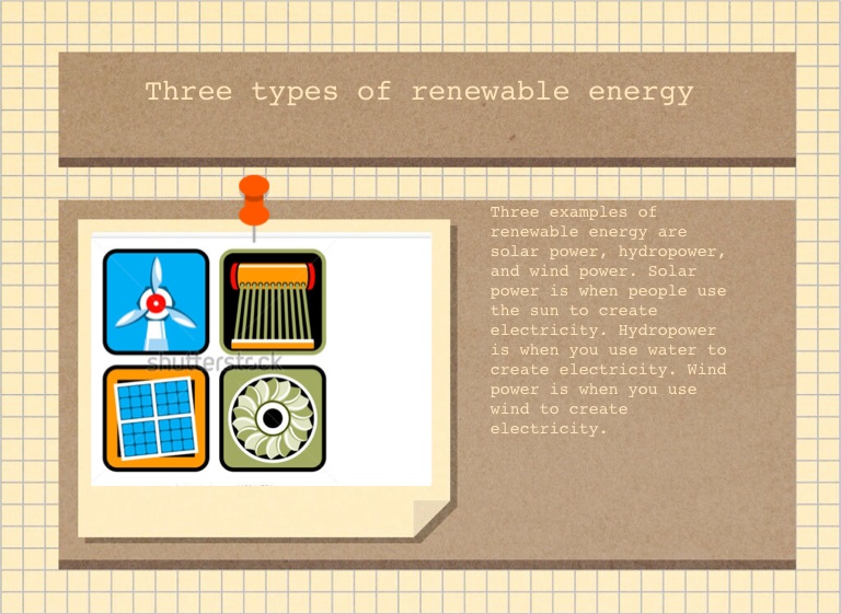 Three examples of renewable energy are solar power, hydropower, and wind power. Solar power is when people use the sun to create electricity. Hydropower is when you use water to create electricity. Wind power is when you use wind to create electricity.