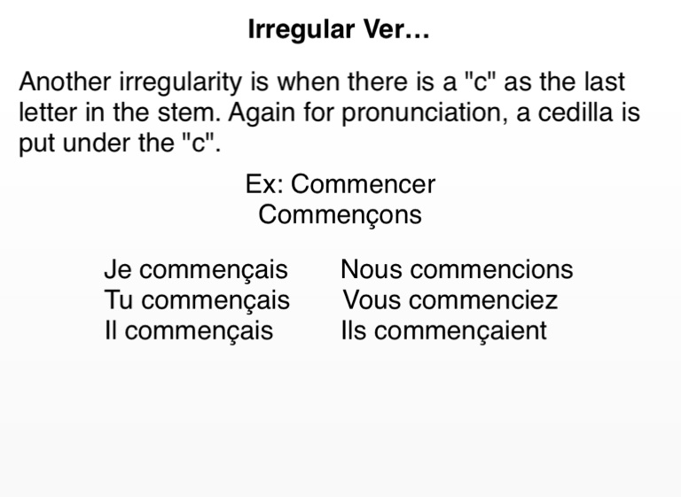 Another irregularity is when there is a "c" as the last letter in the stem. Again for pronunciation, a cedilla is put under the "c".