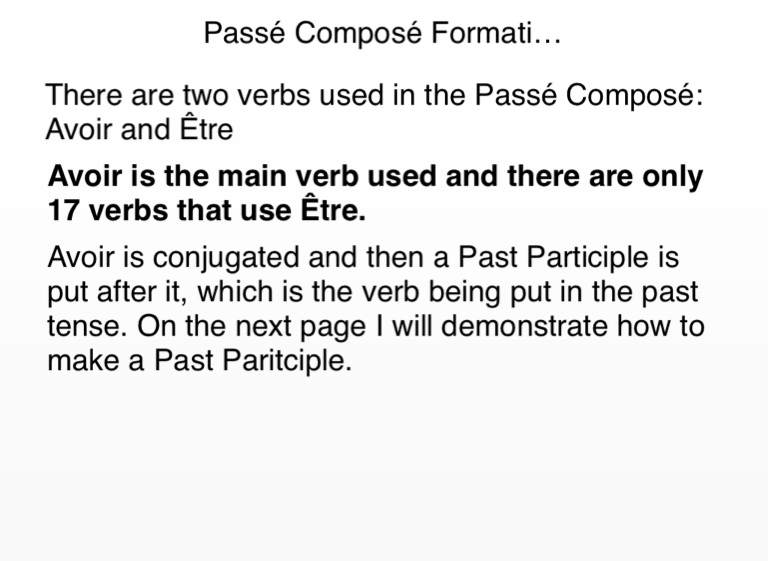 Avoir is conjugated and then a Past Participle is put after it, which is the verb being put in the past tense. On the next page I will demonstrate how to make a Past Paritciple.