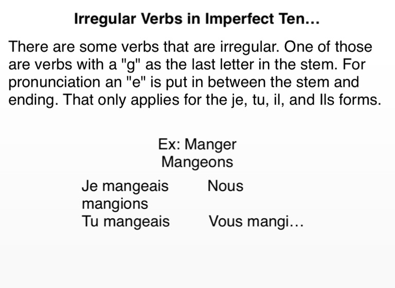 There are some verbs that are irregular. One of those are verbs with a "g" as the last letter in the stem. For pronunciation an "e" is put in between the stem and ending. That only applies for the je, tu, il, and Ils forms.