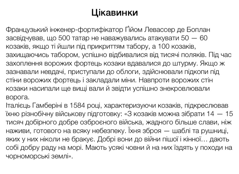Італієць Гамберіні в 1584 році, характеризуючи козаків, підкреслював їхню різнобічну військову підготовку: «З козаків можна зібрати 14 — 15 тисяч добірного добре озброєного війська, жадного більше слави, ніж наживи, готового на всяку небезпеку. Їхня зброя — шаблі та рушниці, яких у них ніколи не бракує. Добрі вони до війни пішої і кінної… дають собі добру раду на морі. Мають усякі човни й на них їздять у походи на чорноморські землі».