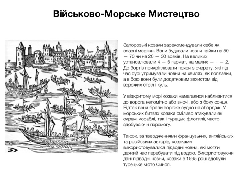 Запорозькі козаки зарекомендували себе як славні моряки. Вони будували човни-чайки на 50 — 70 чи на 20 — 30 вояків. На великих установлювали 4 — 6 гармат, на малих — 1 — 2. До бортів прикріплювати пояси з очерету, які під час бурі утримували човни на хвилях, як поплавки, а в бою вони були додатковим захистом від ворожих стріл і куль.