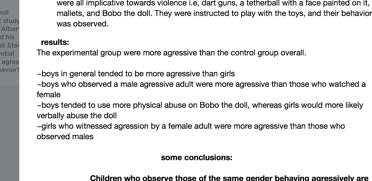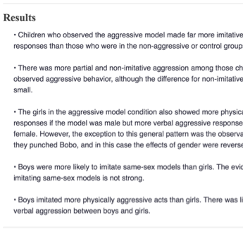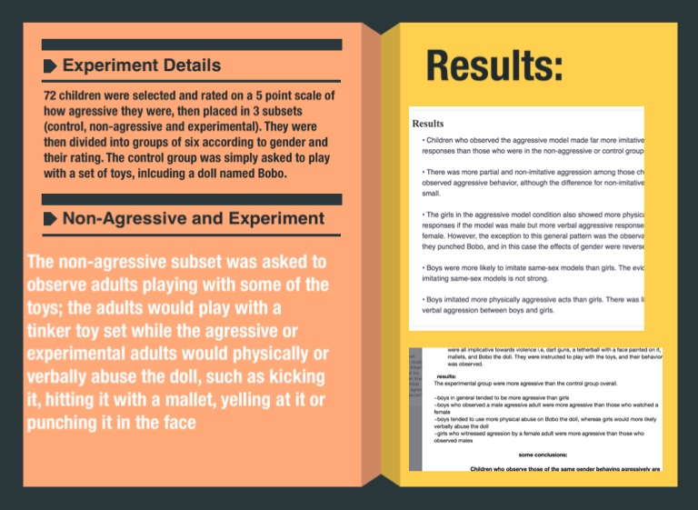 72 children were selected and rated on a 5 point scale of how agressive they were, then placed in 3 subsets (control, non-agressive and experimental). They were then divided into groups of six according to gender and their rating. The control group was simply asked to play with a set of toys, inlcuding a doll named Bobo.