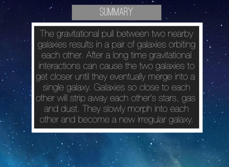 The gravitational pull between two nearby galaxies results in a pair of galaxies orbiting each other. After a long time gravitational interactions can cause the two galaxies to get closer until they eventually merge into a single galaxy. Galaxies so close to each other will strip away each other's stars, gas and dust. They slowly morph into each other and become a new irregular galaxy.