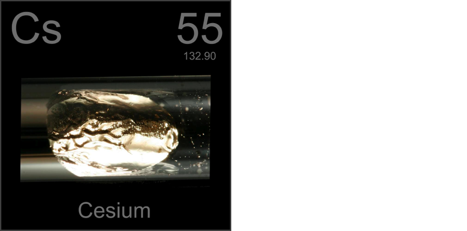 Caesium or cesium is a chemical element with symbol Cs and atomic number 55. It is a soft, silvery-gold alkali metal with a melting point of 28 °C, which makes it one of only five elemental metals that are liquid at or near room temperature.