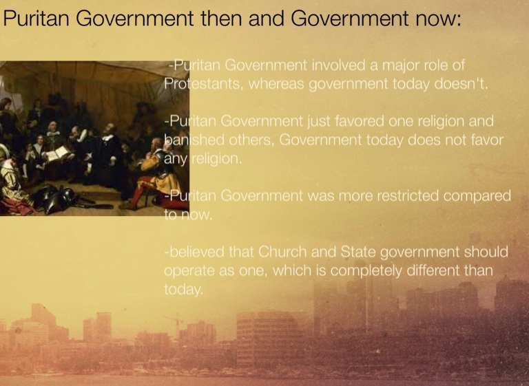 -Puritan Government involved a major role of Protestants, whereas government today doesn't.