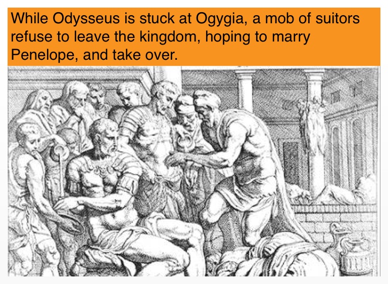 While Odysseus is stuck at Ogygia, a mob of suitors refuse to leave the kingdom, hoping to marry Penelope, and take over.