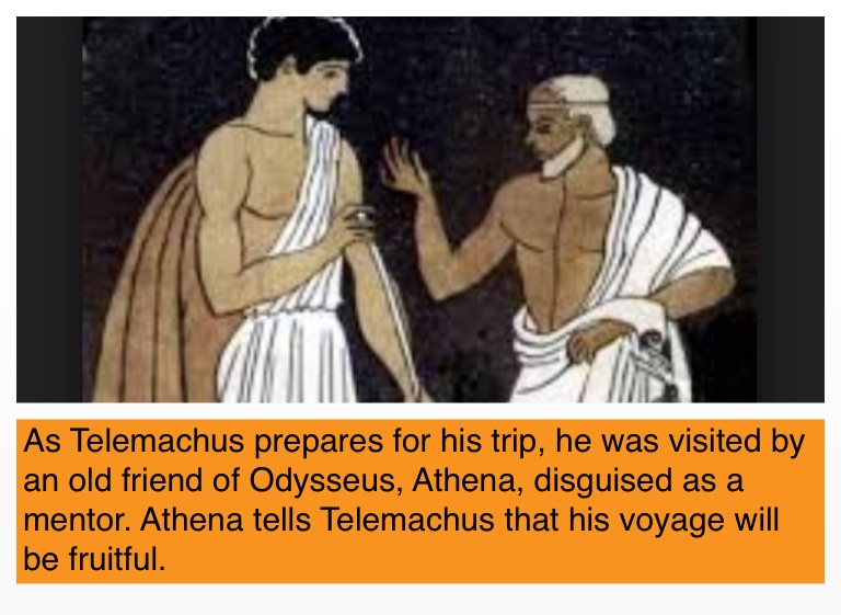 As Telemachus prepares for his trip, he was visited by an old friend of Odysseus, Athena, disguised as a mentor. Athena tells Telemachus that his voyage will be fruitful.