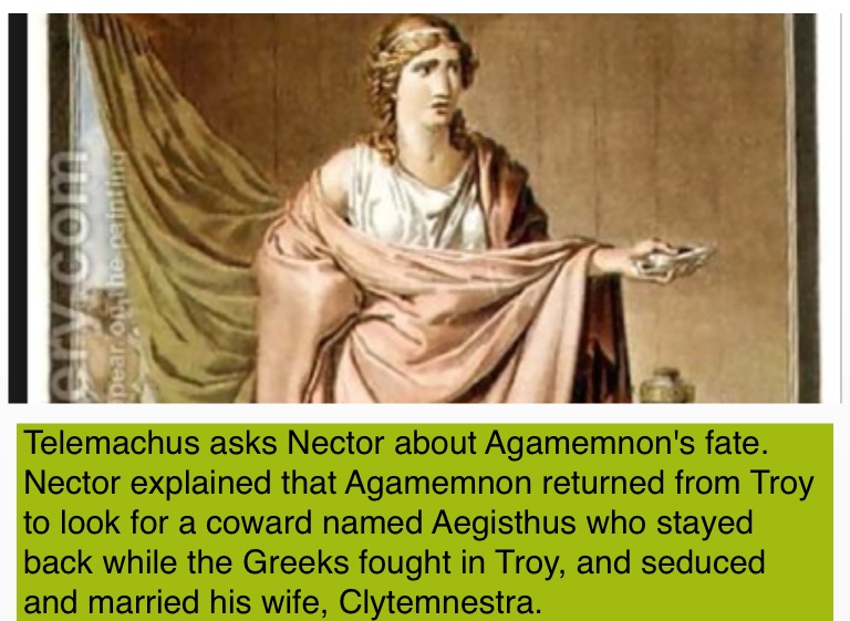 Telemachus asks Nector about Agamemnon's fate. Nector explained that Agamemnon returned from Troy to look for a coward named Aegisthus who stayed back while the Greeks fought in Troy, and seduced and married his wife, Clytemnestra.