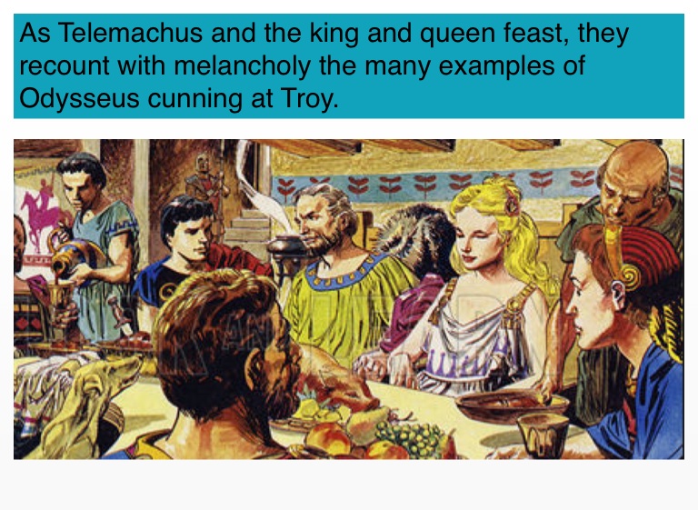 As Telemachus and the king and queen feast, they recount with melancholy the many examples of Odysseus cunning at Troy.