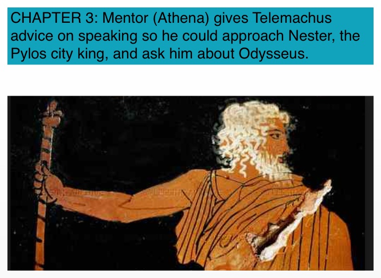 CHAPTER 3: Mentor (Athena) gives Telemachus advice on speaking so he could approach Nester, the Pylos city king, and ask him about Odysseus.