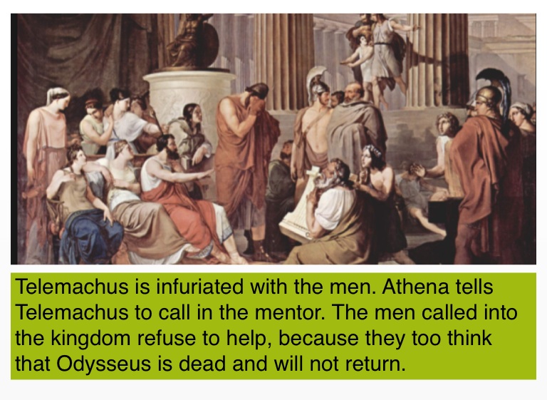 Telemachus is infuriated with the men. Athena tells Telemachus to call in the mentor. The men called into the kingdom refuse to help, because they too think that Odysseus is dead and will not return.