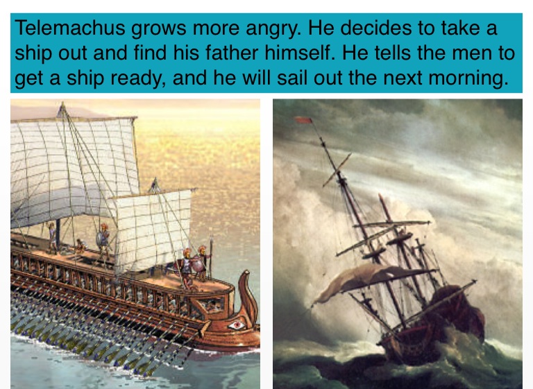 Telemachus grows more angry. He decides to take a ship out and find his father himself. He tells the men to get a ship ready, and he will sail out the next morning.
