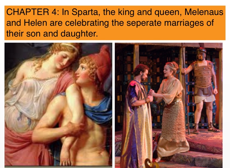 CHAPTER 4: In Sparta, the king and queen, Melenaus and Helen are celebrating the seperate marriages of their son and daughter.