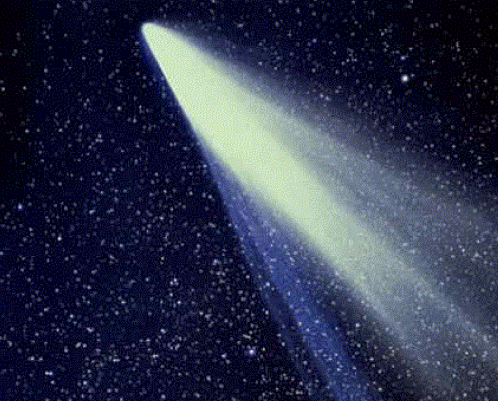 A comet is a piece of ice that revolves around something. It has a tail that it leaves behind wherever it goes.