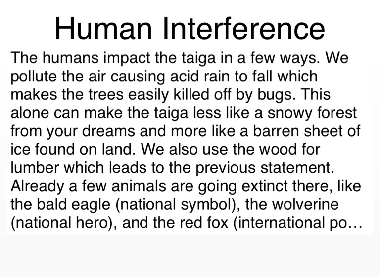 The humans impact the taiga in a few ways. We pollute the air causing acid rain to fall which makes the trees easily killed off by bugs. This alone can make the taiga less like a snowy forest from your dreams and more like a barren sheet of ice found on land. We also use the wood for lumber which leads to the previous statement. Already a few animals are going extinct there, like the bald eagle (national symbol), the wolverine (national hero), and the red fox (international popstar)