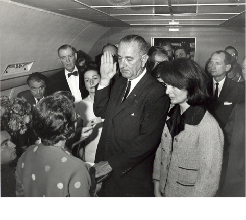 Vice-president, Lyndon B Johnson is sworn in as president on JFK’s Bible while standing in a cramped compartment of Air Force One, next to his wife and Mrs. Kennedy.