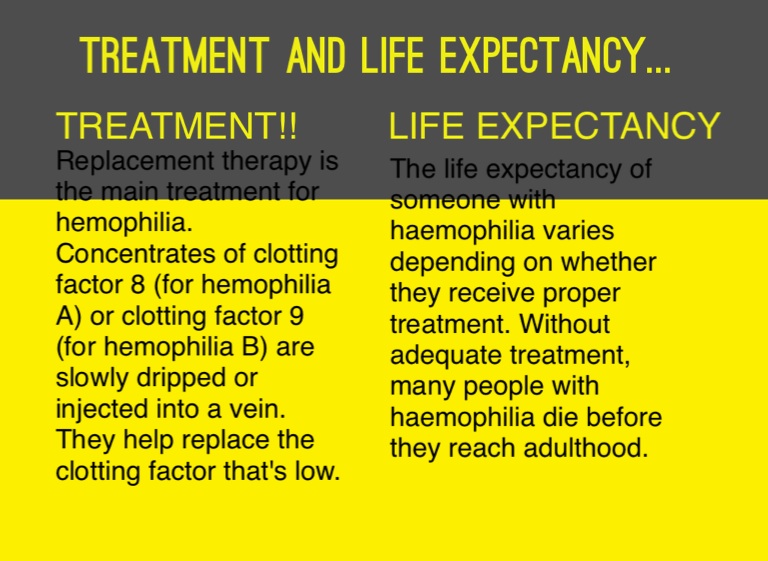 The life expectancy of someone with haemophilia varies depending on whether they receive proper treatment. Without adequate treatment, many people with haemophilia die before they reach adulthood.