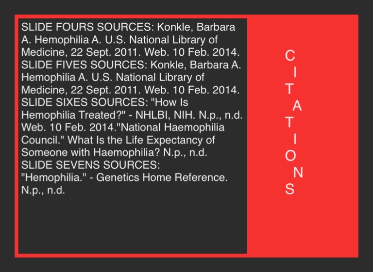 SLIDE FIVES SOURCES: Konkle, Barbara A. Hemophilia A. U.S. National Library of Medicine, 22 Sept. 2011. Web. 10 Feb. 2014.