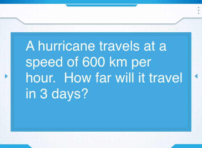 A hurricane travels at a speed of 600 km per hour. How far will it travel in 3 days?