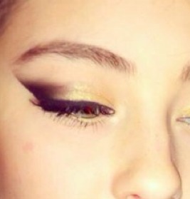Eyes are gold and black eyeshadow with mascara and thin eyeliner.