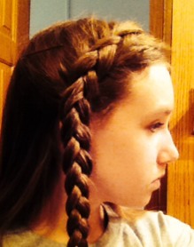 The hair is a dutch braid starting at the middle of the head and going to the ear where it begins to be just a regular braid. It's easier to do on yourself than a french braid. And the braid will “pop off” your head, like a bump.