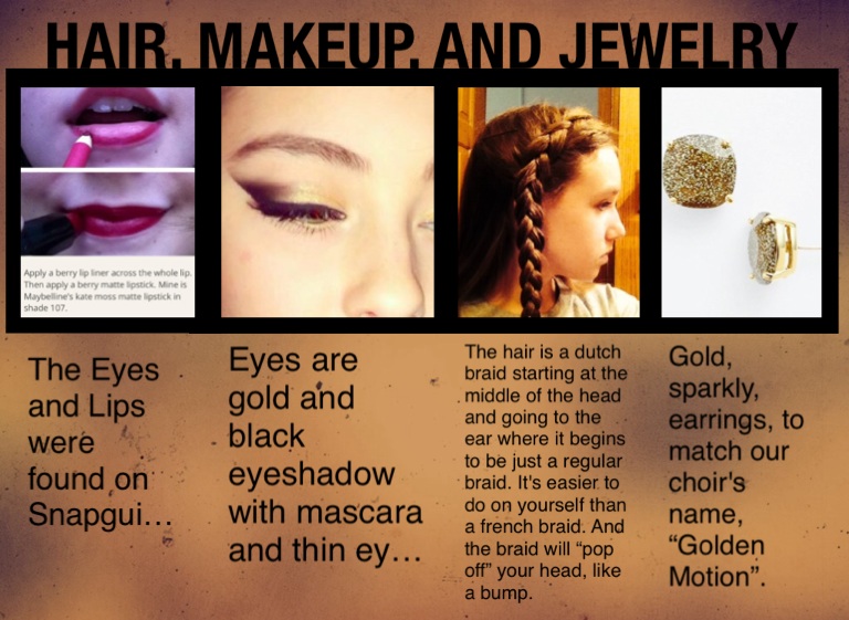 Gold, sparkly, earrings, to match our choir's name, “Golden Motion”.