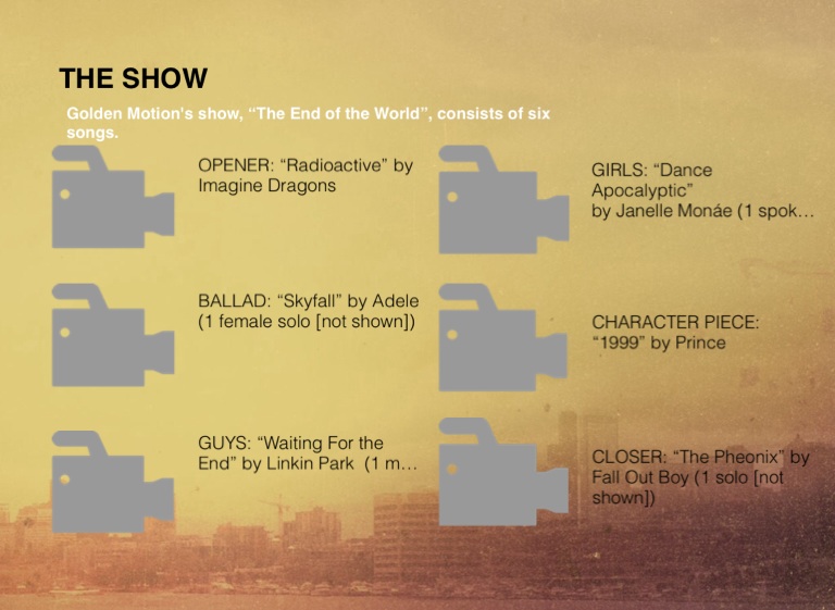 Golden Motion's show, “The End of the World”, consists of six songs.