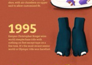 Kenyas Christopher Kroger wins a steeple chase with nothing on his feed but two pieces of tape on his two feet. He was the first to win a steeplechase in nothing but his bare feet in a while.