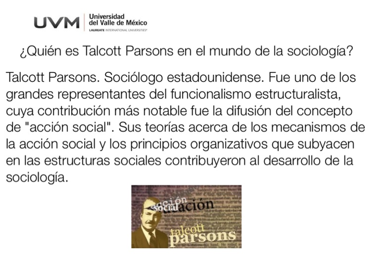 Talcott Parsons. Sociólogo estadounidense. Fue uno de los grandes representantes del funcionalismo estructuralista, cuya contribución más notable fue la difusión del concepto de "acción social". Sus teorías acerca de los mecanismos de la acción social y los principios organizativos que subyacen en las estructuras sociales contribuyeron al desarrollo de la sociología.