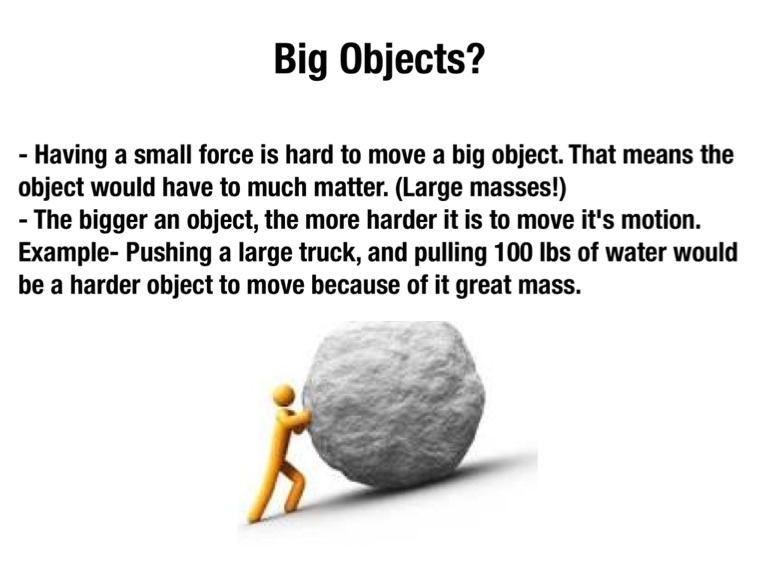 Example- Pushing a large truck, and pulling 100 lbs of water would be a harder object to move because of it great mass.