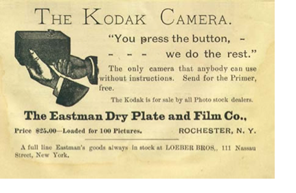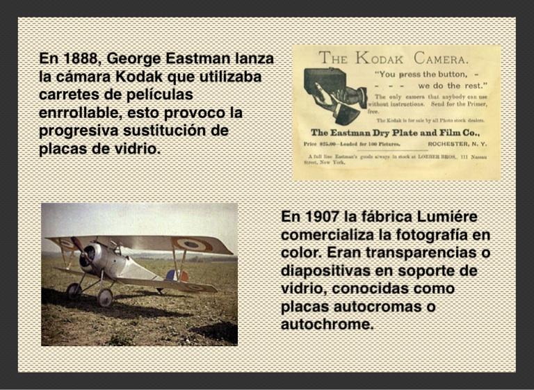 En 1888, George Eastman lanza la cámara Kodak que utilizaba carretes de películas enrrollable, esto provoco la progresiva sustitución de placas de vidrio.
