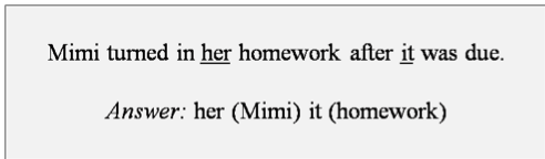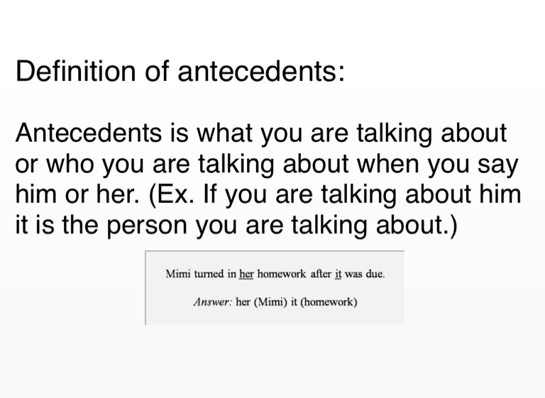 Antecedents is what you are talking about or who you are talking about when you say him or her. (Ex. If you are talking about him it is the person you are talking about.)