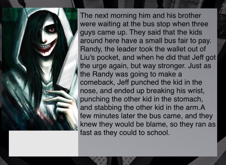 The next morning him and his brother were waiting at the bus stop when three guys came up. They said that the kids around here have a small bus fair to pay. Randy, the leader took the wallet out of Liu's pocket, and when he did that Jeff got the urge again, but way stronger. Just as the Randy was going to make a comeback, Jeff punched the kid in the nose, and ended up breaking his wrist, punching the other kid in the stomach, and stabbing the other kid in the arm.A few minutes later the bus came, and they knew they would be blame, so they ran as fast as they could to school.