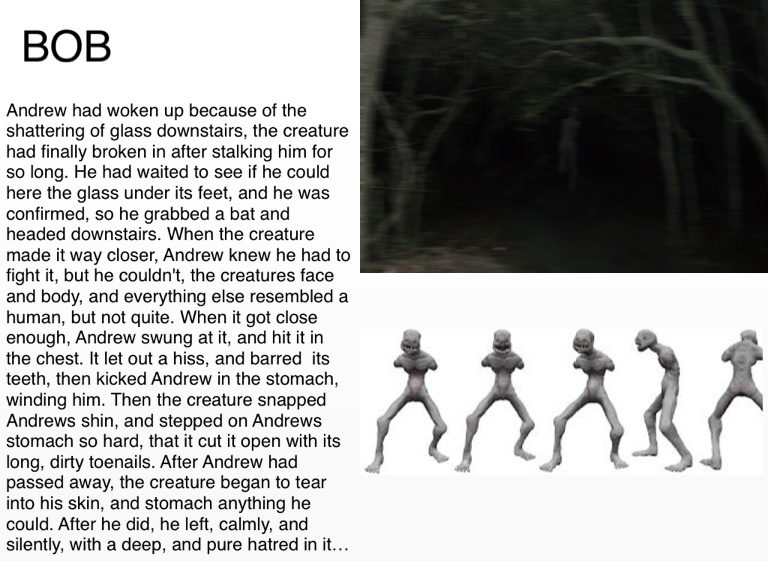 Andrew had woken up because of the shattering of glass downstairs, the creature had finally broken in after stalking him for so long. He had waited to see if he could here the glass under its feet, and he was confirmed, so he grabbed a bat and headed downstairs. When the creature made it way closer, Andrew knew he had to fight it, but he couldn't, the creatures face and body, and everything else resembled a human, but not quite. When it got close enough, Andrew swung at it, and hit it in the chest. It let out a hiss, and barred its teeth, then kicked Andrew in the stomach, winding him. Then the creature snapped Andrews shin, and stepped on Andrews stomach so hard, that it cut it open with its long, dirty toenails. After Andrew had passed away, the creature began to tear into his skin, and stomach anything he could. After he did, he left, calmly, and silently, with a deep, and pure hatred in its heart.