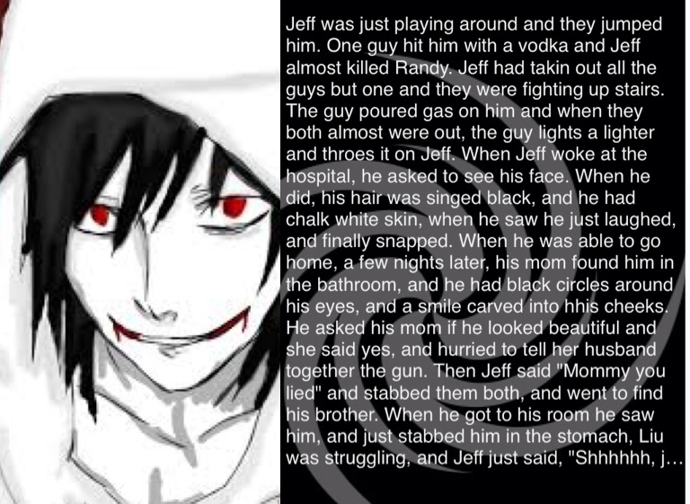 Jeff was just playing around and they jumped him. One guy hit him with a vodka and Jeff almost killed Randy. Jeff had takin out all the guys but one and they were fighting up stairs. The guy poured gas on him and when they both almost were out, the guy lights a lighter and throes it on Jeff. When Jeff woke at the hospital, he asked to see his face. When he did, his hair was singed black, and he had chalk white skin, when he saw he just laughed, and finally snapped. When he was able to go home, a few nights later, his mom found him in the bathroom, and he had black circles around his eyes, and a smile carved into hhis cheeks. He asked his mom if he looked beautiful and she said yes, and hurried to tell her husband together the gun. Then Jeff said "Mommy you lied" and stabbed them both, and went to find his brother. When he got to his room he saw him, and just stabbed him in the stomach, Liu was struggling, and Jeff just said, "Shhhhhh, just go to sleep."