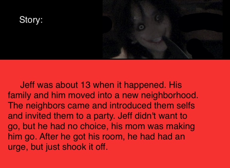 Jeff was about 13 when it happened. His family and him moved into a new neighborhood. The neighbors came and introduced them selfs and invited them to a party. Jeff didn't want to go, but he had no choice, his mom was making him go. After he got his room, he had had an urge, but just shook it off.