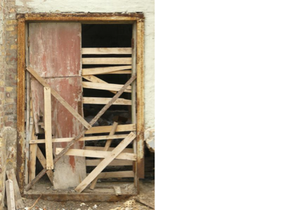 A board was nailed across the front door, but Charles
